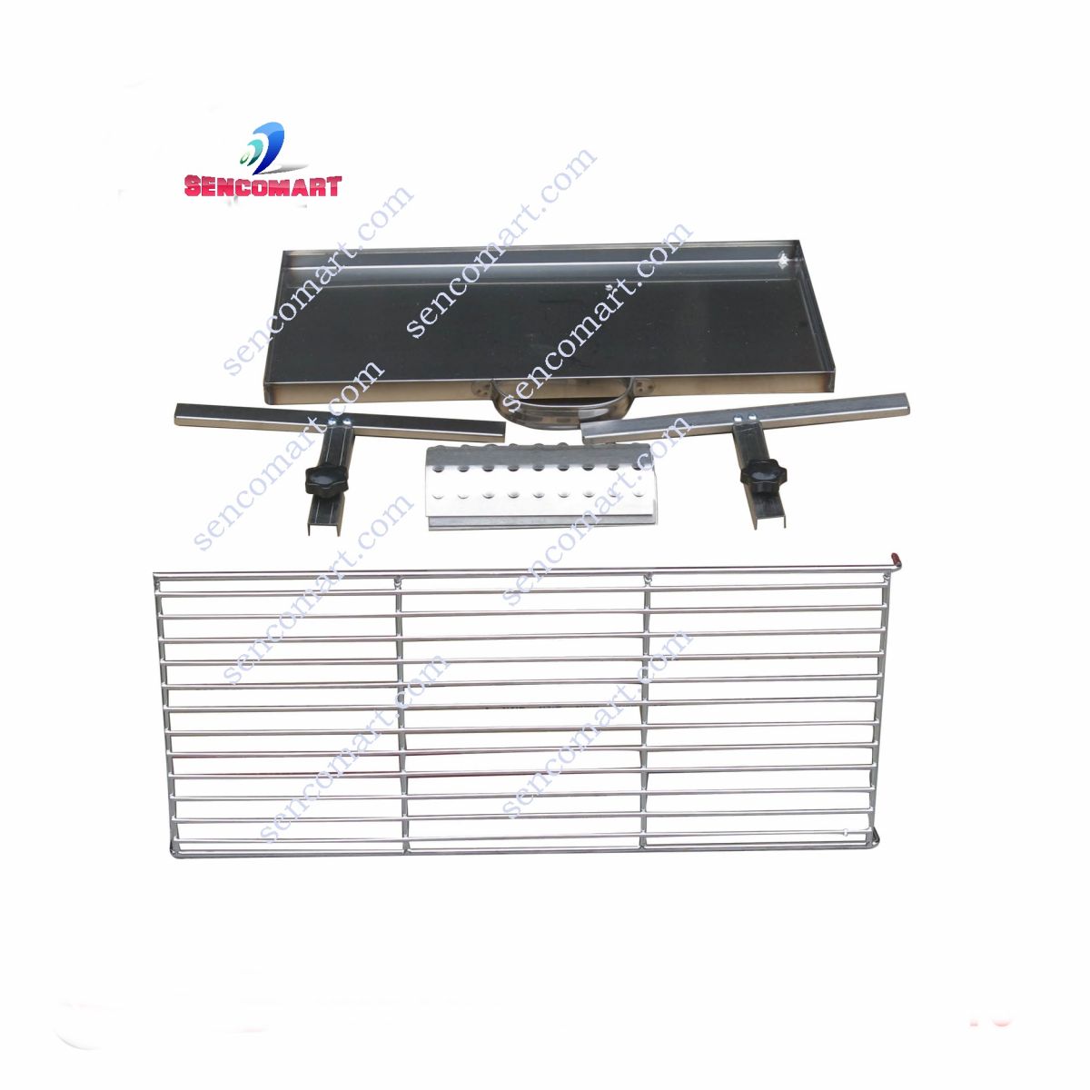 Bộ phụ kiện của bếp nướng Gas hồng ngoại SENCO4N, gồm: Vỉ chắn họng đốt, vỉ nướng, thanh đỡ vỉ nướng hai bên hông, khay hứng mỡ thừa bên dưới bếp. Tất cả được làm bằng Inox sáng bóng, bền, đẹp và vệ sinh dễ dàng.