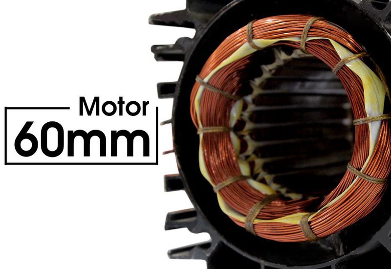 Máy nén khí không dầu sử dụng lõi quấn dây trong motor dày 63mm với bộ nòng 63mm lớn hơn các sản phẩm cùng dòng khác trên thị trường nên tốc độ nén hơi nhanh hơn, chỉ tốn chưa tới 3 phút đã có thể nạp đầy 24 lít hơi