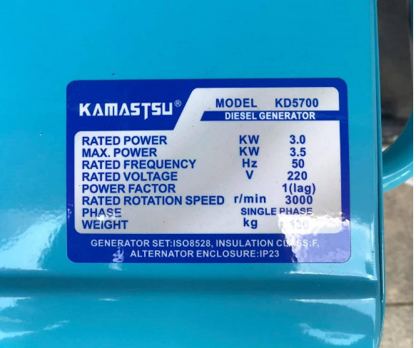 – Máy phát điện chạy dầu 3Kw Kamastsu KD5700 là dòng máy phát điện với mức công suất vừa phải dành cho gia đình hoặc nhà xưởng, cửa hàng nhỏ, máy. Được thiết kế chắc chắn với độ chống ồn tiêu chuẩn, thân thiện với môi trường.