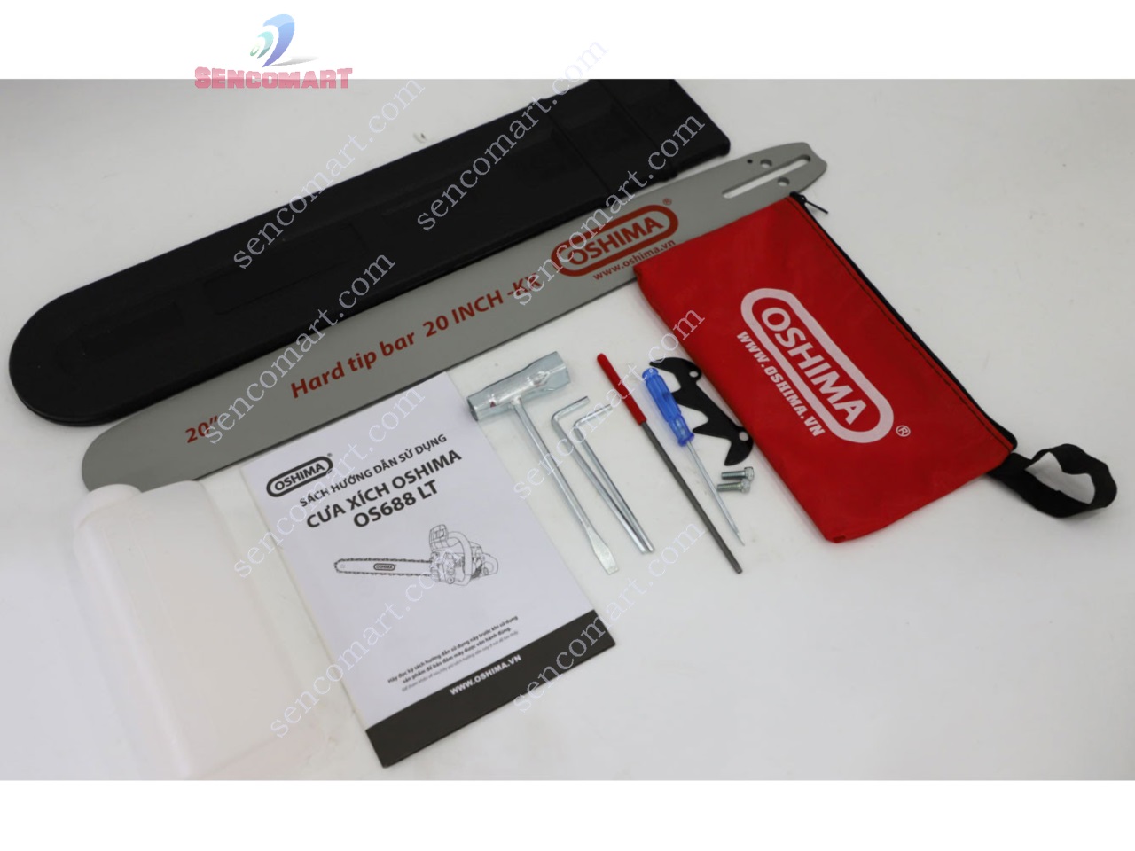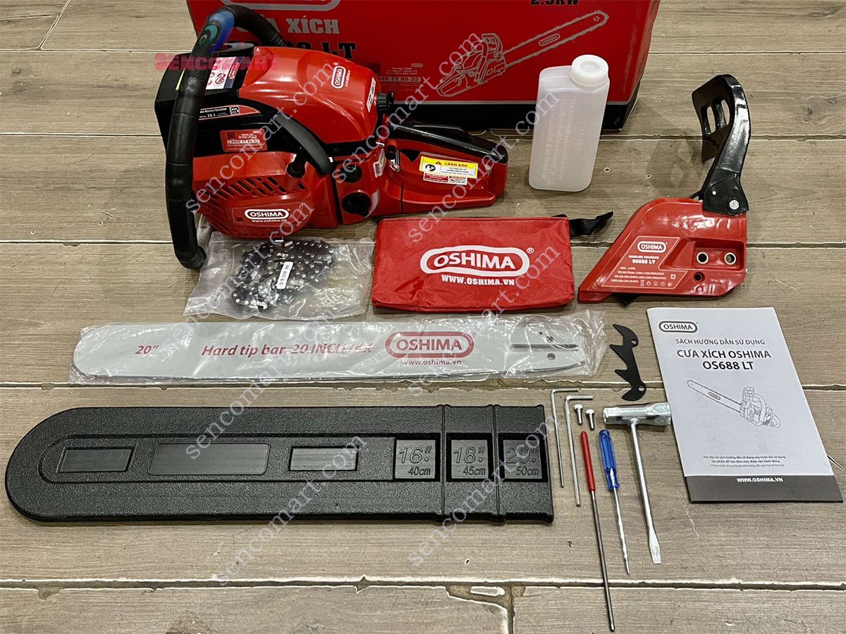 Máy cưa xích Oshima đi kèm bình pha, cần gạt ốp lam, lam xích, túi phụ tùng có vít, thanh chắn cưa, khóa mở bugi.