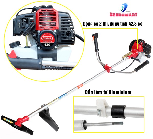 Máy cắt cỏ Oshima 430 sử dụng động cơ hai thì được làm mát bằng khí và xilanh đơn hoạt động với năng suất máy 1.5KW với khả năng quay mạnh mẽ 10.000 vòng/phút cùng dung tích bình xăng lên tới 42.8cc, đường kính xilanh 40mm. Với màng lọc đi kèm giúp người dùng có thể tiết kiệm được nhiên liệu khi sử dụng mà máy vẫn luôn hoạt động vô cùng ổn định và mạnh mẽ.