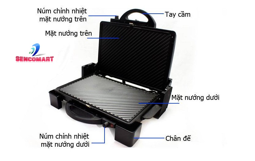 Hai mặt nướng được phủ men chống dính, có khả năng chống dính cao, điều này giúp chúng ta vệ sinh máy dễ dàng hơn sau một ngày sử dụng, 2 mặt nướng có thiết kế kiểu mặt sần, với những đường chéo, khi ép chúng sẽ tạo lên những đường chéo trên bánh mỳ nhìn khá bắt mắt. để vệ sinh mặt nướng chúng ta có thể dễ dàng tháo ra và vệ sinh.