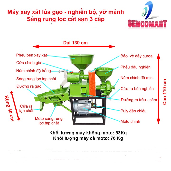 Máy xay xát gạo ba chức năng xay xát lúa gạo – nghiền bột mịn, vỡ ngô vỡ đỗ SENCO3CN
